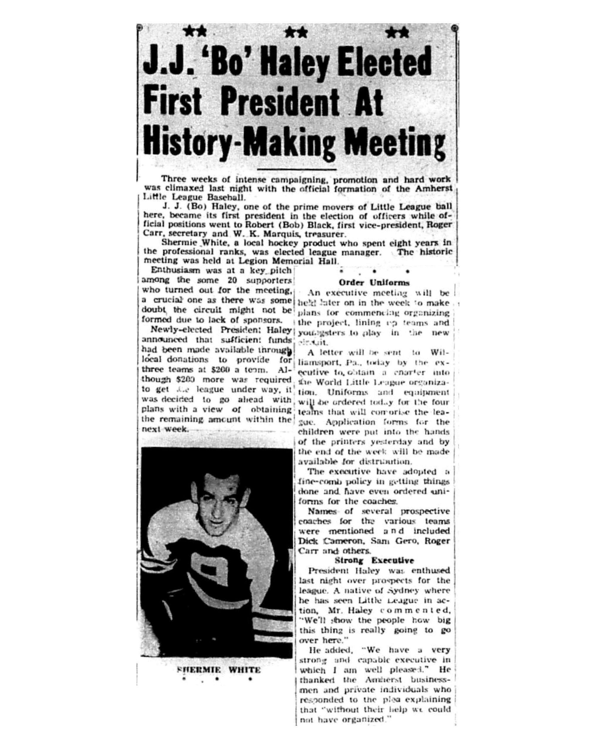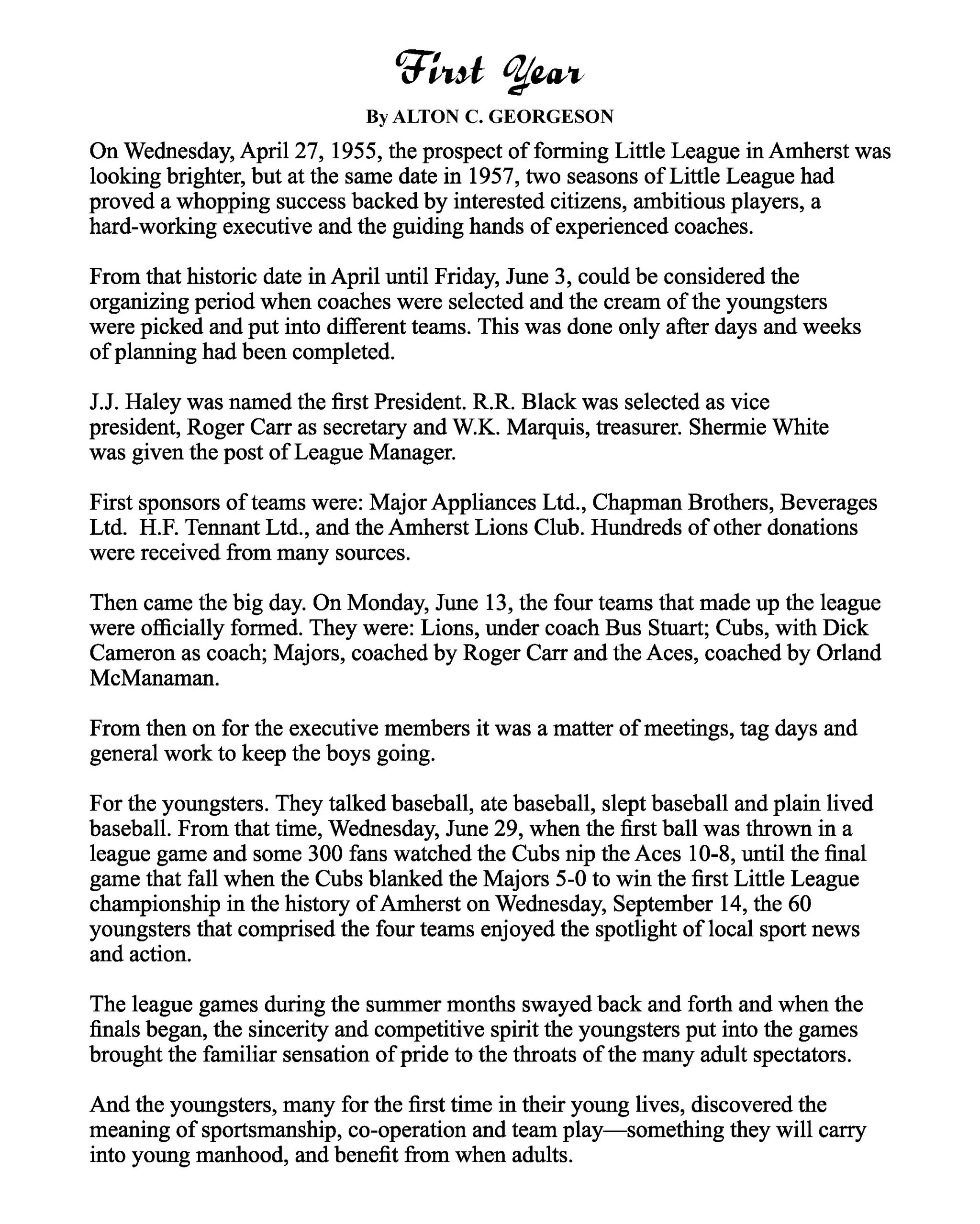 The Amherst Little League Baseball Club is a registered non profit society and has been providing the youth of Amherst Nova Scotia, the opportunity to play baseball for free every summer since 1955. It began as a modest program of two teams and a couple dozen players who played on the baseball field behind the old Amherst Regional High School and the present home of Spring Street Academy.