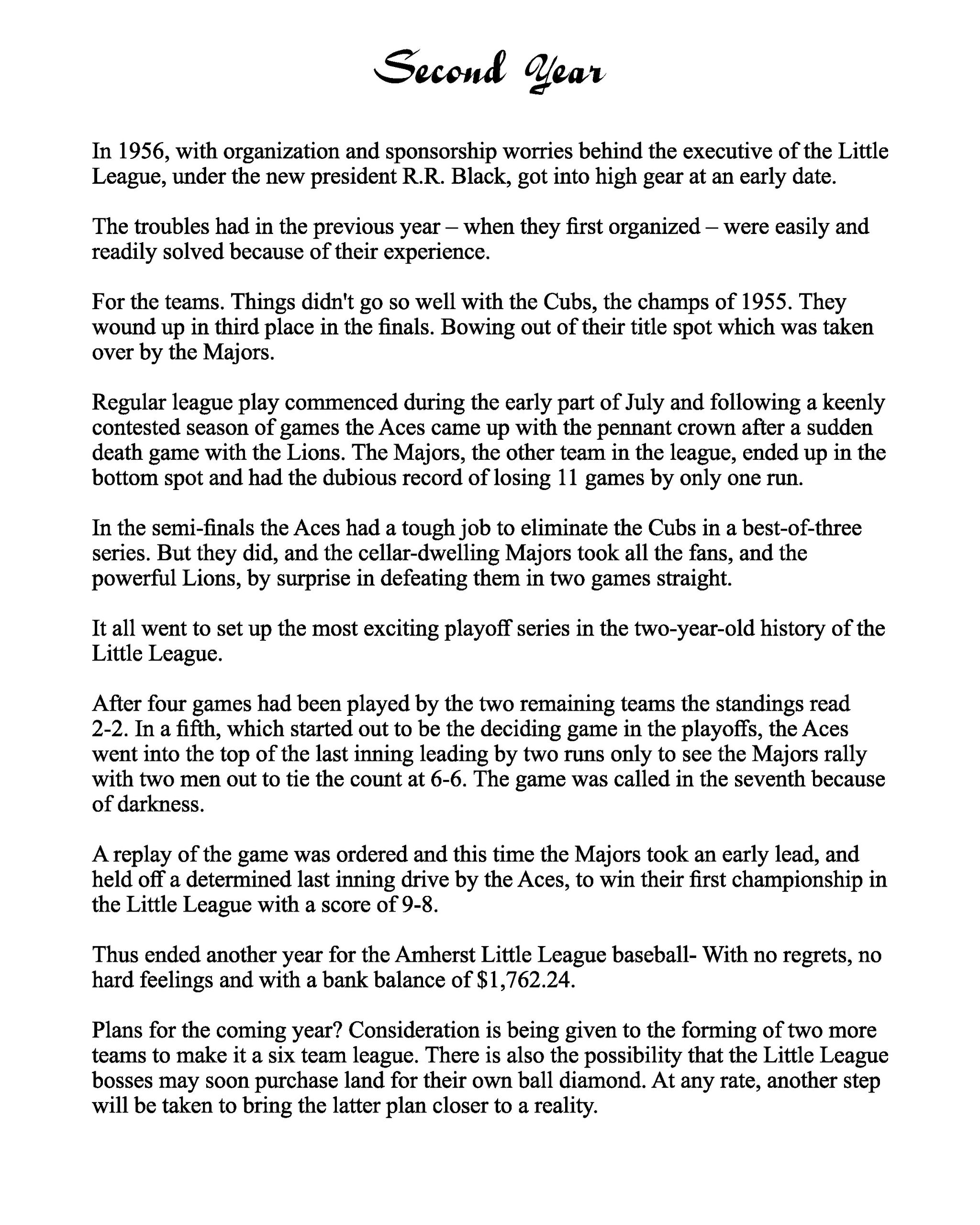 Since those first few years, the league has grown by leaps and bounds to the program you see today. Today the Amherst Little League is located at 47 Croft Street. The organization now has two Little League sized baseball diamonds, a T-Ball sized field, a two lane batting cage and a two story clubhouse.